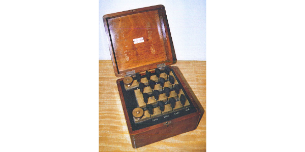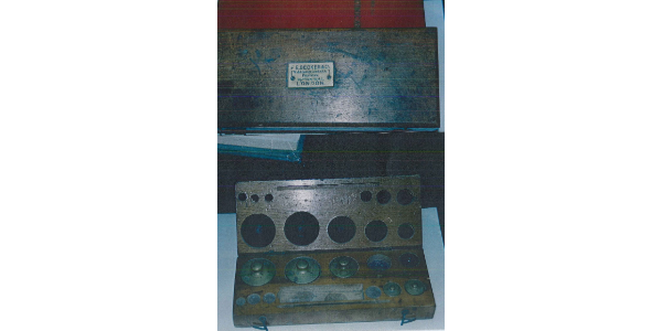 • Características:​ Caja de pesas para balanzas de laboratorio. Es interesante porque procede de los inicios de IQS, e incluso figura en las relaciones de los materiales recuperados después de la Guerra Civil Española (1939).​
