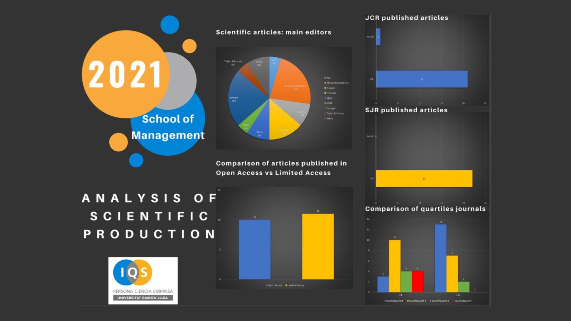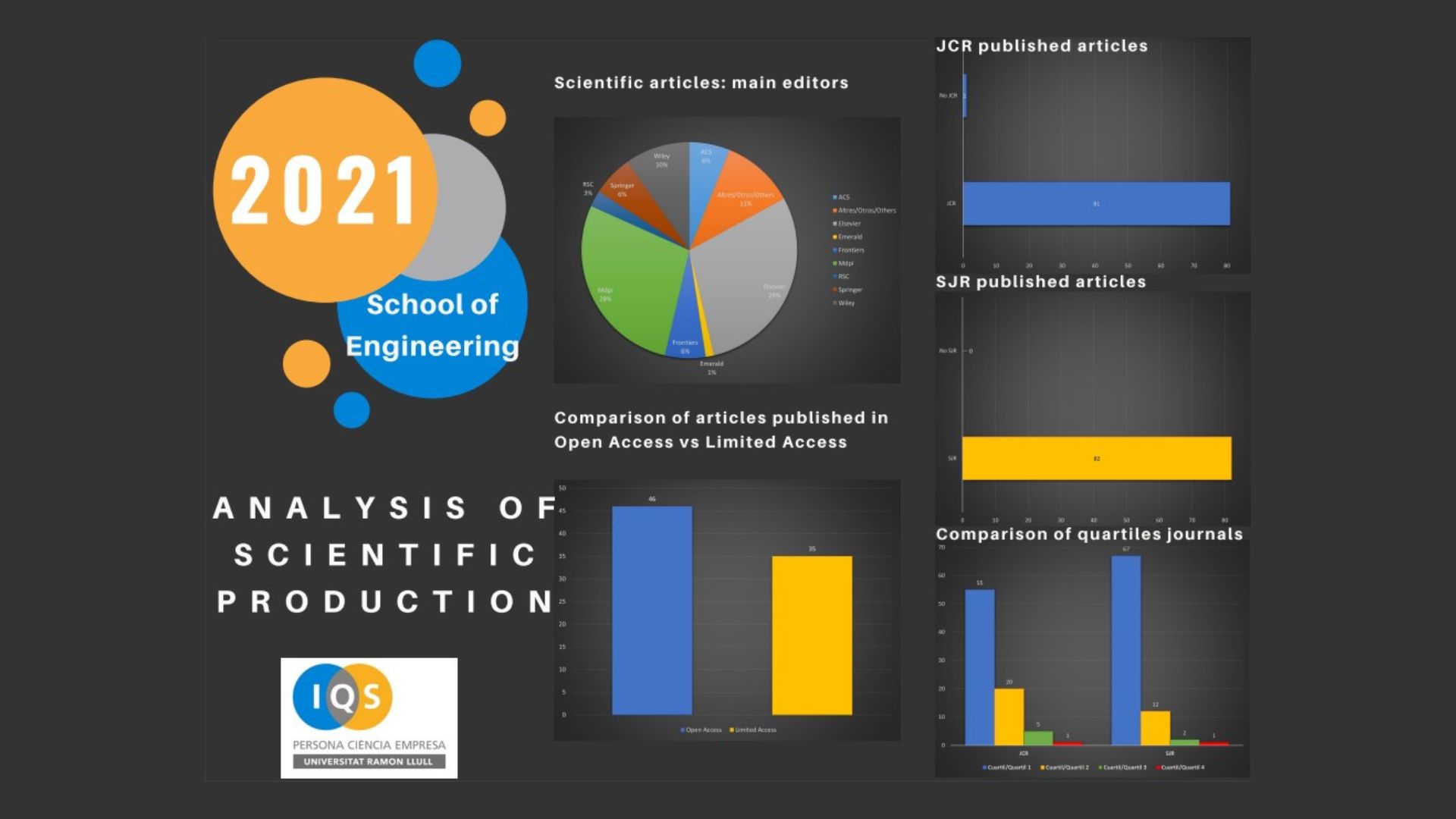 The report details the total number of articles published by each School during 2021. This includes how many were published in open access, the main publishers, and the Quartile ranking of the journals indexed in JCR and CiteScore.