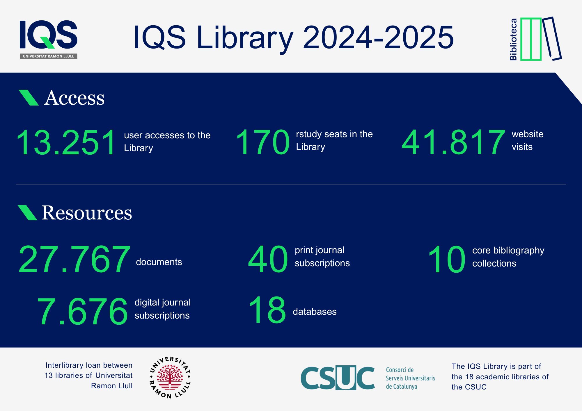 In this section, we present a selection of indicators reflecting the activity of the IQS Library during last academic year. The figures are presented in a visual format to make them easy to consult and to provide a clear overview of the use of our services, collections, electronic resources, and more.