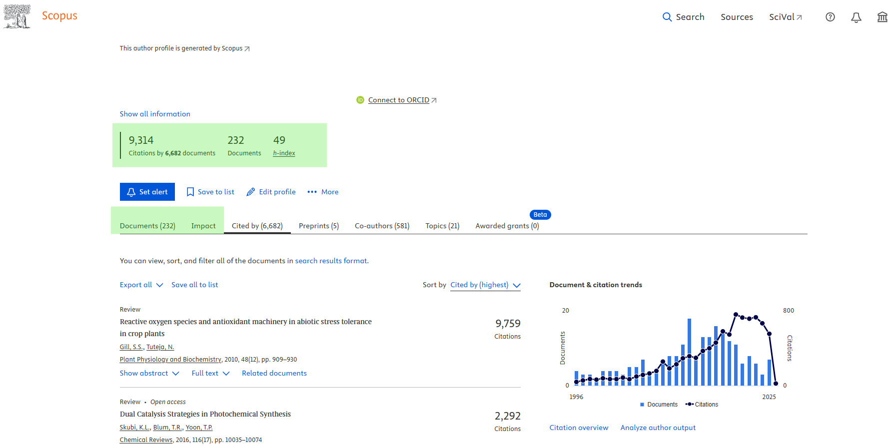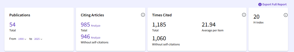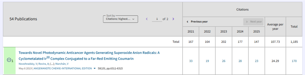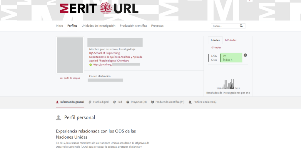 - En la parte superior se muestran las métricas principales: índice H, número total de citas recibidas y número total de documentos.
