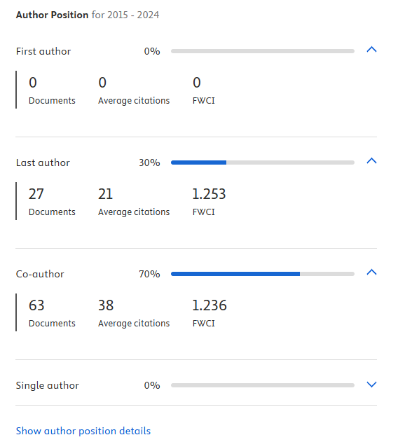 - En la misma pestaña de Documents puedes consultar el porcentaje y número de publicaciones en las que la persona es primer autor, último autor, coautor y autor único. Se acompaña con una media de citas recibidas y el FWCI.
