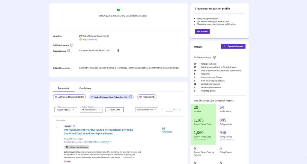 - En el panel derecho, Web of Science Core Collection metrics, se muestra el índice H del autor y el Sum of Times Cited.