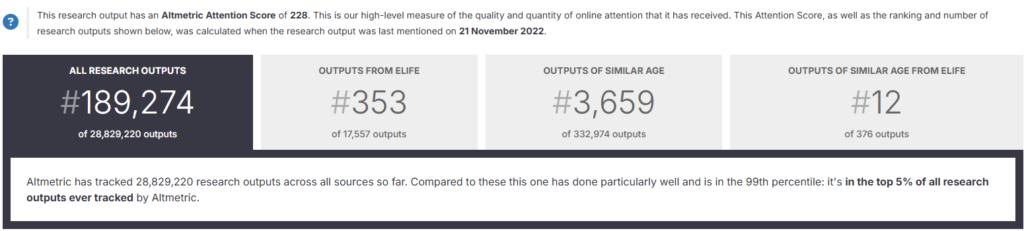- Attention Score in Context: se compara el puntaje del artículo con otros trabajos similares. Por ejemplo, muestra si está entre los más comentados dentro de la misma revista, del mismo año o misma temática seguidos por Altmetric. Sirve para poner en perspectiva el nivel de atención que ha recibido.