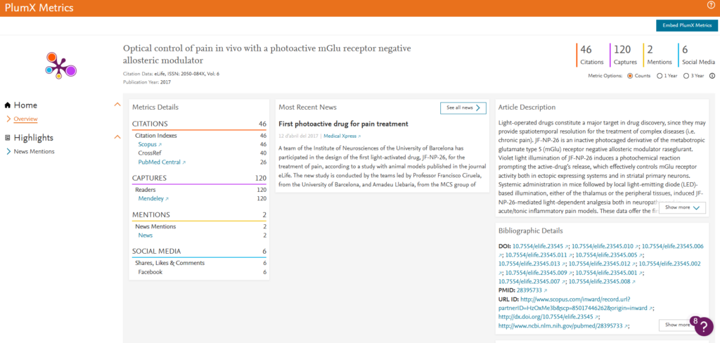 El artículo “Optical control of pain in vivo with a photoactive mGlu receptor negative allosteric modulator” ha acumulado 46 citas en bases como Scopus, CrossRef y PubMed Central, y cuenta con 120 capturas en Mendeley, lo que indica un fuerte interés académico sostenido. Estas cifras reflejan que el estudio ha sido utilizado como referencia y ha tenido un nivel relevante de consulta por parte de otros investigadores en el campo.