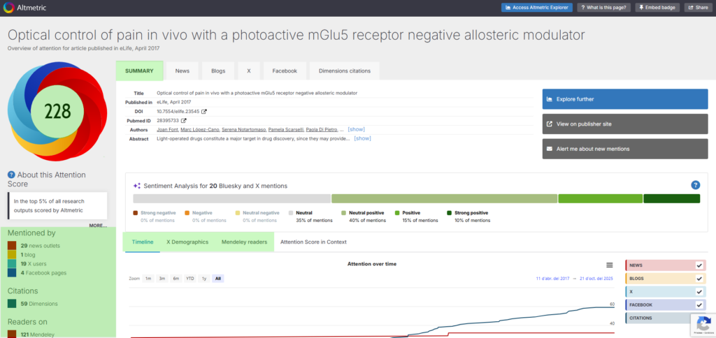 El artículo “Optical control of pain in vivo with a photoactive mGlu₅ receptor negative allosteric modulator” ha alcanzado un Altmetric Attention Score de 228, posicionándose dentro del 5 % superior de todas las publicaciones científicas evaluadas por Altmetric. Destaca especialmente por su nivel de atención, situándose en el percentil 98 respecto a publicaciones de la misma edad y en el percentil 96 dentro de su misma fuente y antigüedad. Esta puntuación refleja un alto nivel de interés tanto en medios académicos como no académicos.