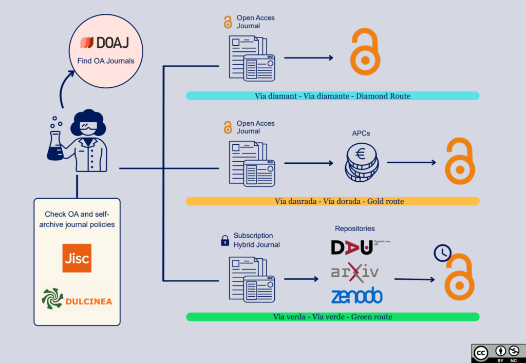Infografía de las vías de publicación en abierto Más información en Guía: Depósito de publicaciones en DAU.