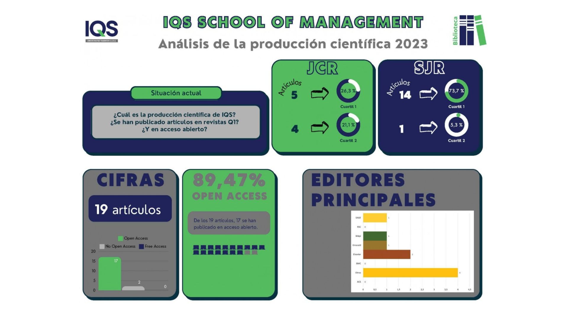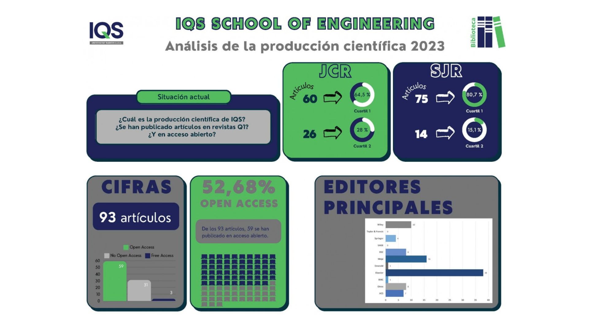 En el informe se expone el número total de artículos publicados en cada School durante el año 2023. Entre ellos, cuántos se han publicado en acceso abierto, las editoriales principales y en qué Cuartil se posicionan las revistas indexadas en JCR y CiteScore.