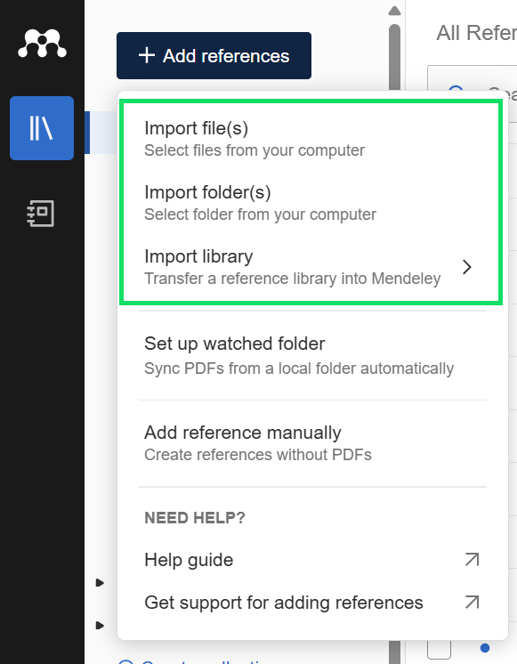 Mendeley ofrece varias maneras para guardar tus documentos, a través de la opción + Add references: